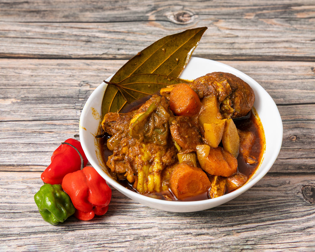 A stew made w/a variation of curry powders, turmeric, all purpose seasoning, seasoned salt, ground pepper, cumin, yellow and green onions, scallion, thyme, paprika, pimento, coriander, ginger, garlic, carrots and potatoes, scotch bonnet pepper, peanut butter*, cooked in vegetable oil.