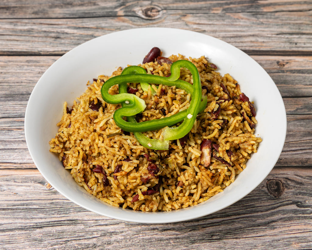 The Jamerican's Jamaican Rice and Peas are made from long grain basmati rice with coconut milk, fresh kidney beans, fresh seasonings of: green onion, yellow onion, thyme, scotch bonnet pepper*, garlic, ginger, ground pepper, onion powder, garlic powder.